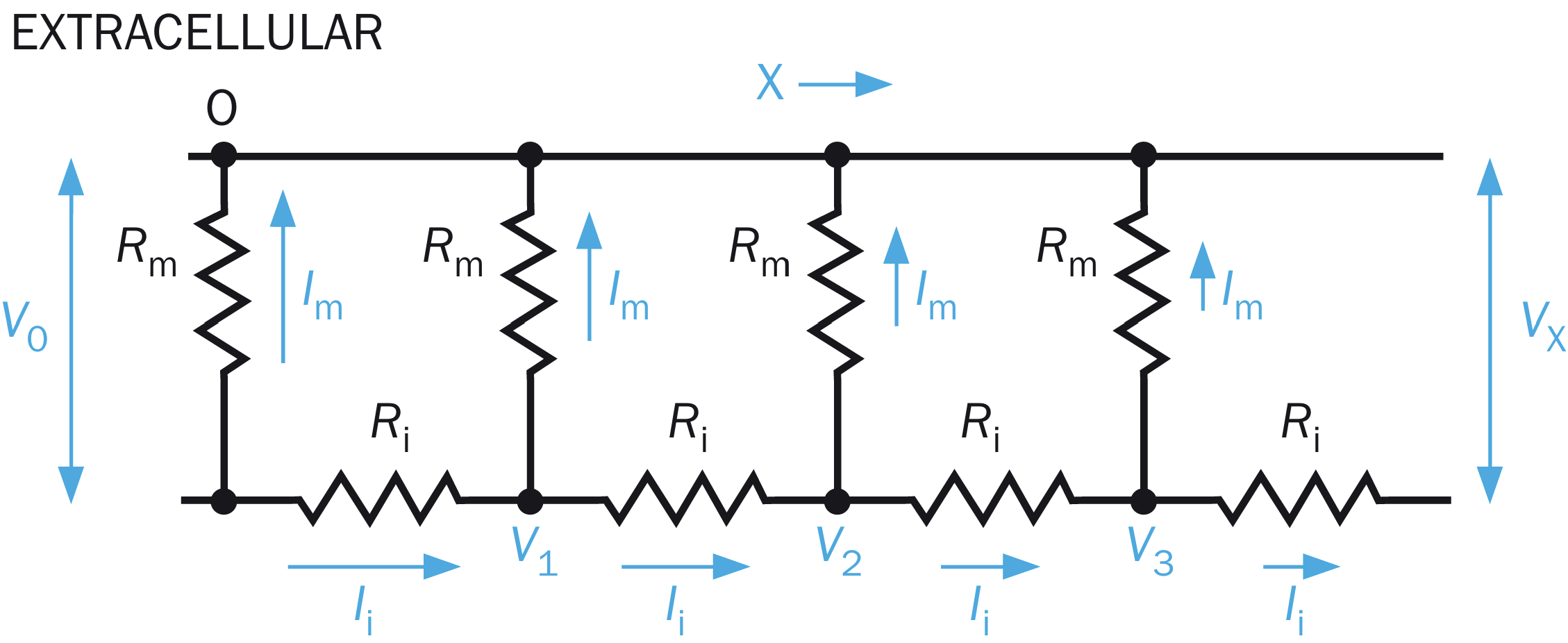 轴向电流衰减到跨膜电流,跨膜电流有电容器充电电流(其实就是经过跨膜电阻的部分)和漏电电流两部分组成: