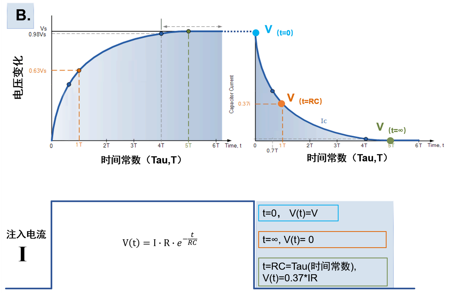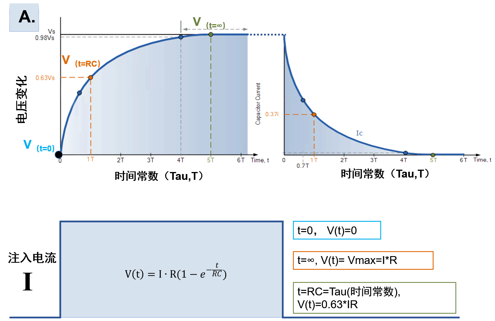 因此对于电流大小与刺激时间也有类似关系:充电时通过电阻的电流大小为