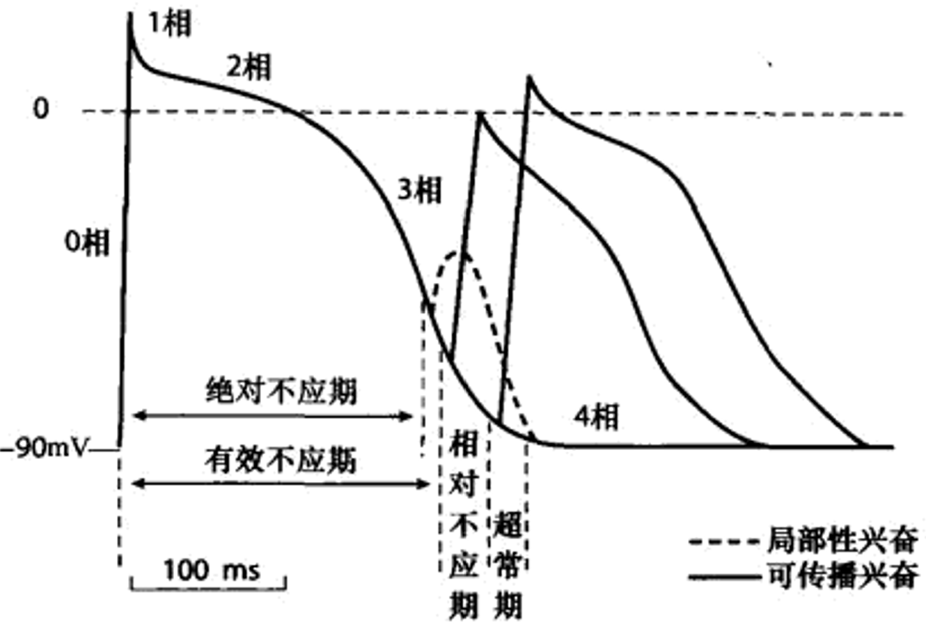 绝对不应期的长短与动作电位时程有关(神经元≤1ms),相对不应期稳定是几毫秒的时长、与动作电位时程相关不大,有效不应期则是对于心肌细胞而言:在绝对不应期及其之后的一段时间内,检验刺激无论是否能够引发被刺激细胞本身的主动反应,都不能引发心肌组织产生可传播的兴奋(可传播性限制主要是相邻细胞通道还死着)。