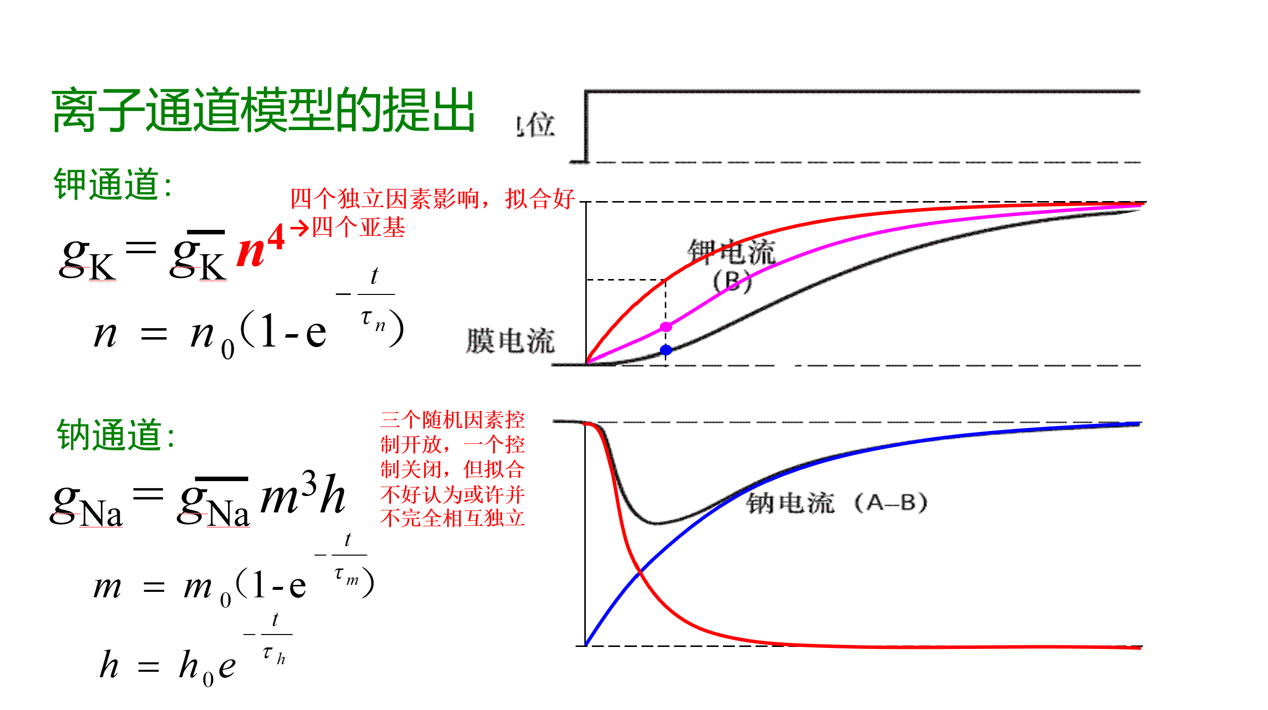 H-H模型中描述的“带电颗粒”事实上真实存在,对应于钾通道的四个亚基和钠通道的四个结构域(“容易理解钠通道不是相同的四个亚基而是连在一起的四个结构域”,书上这么说是因为