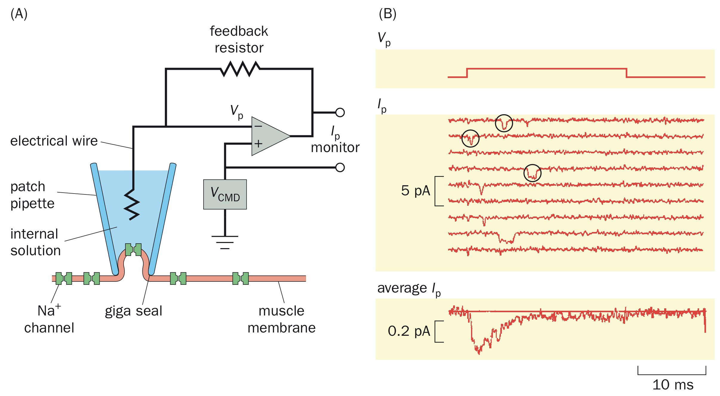 受限于精度,电压钳只能够观察整细胞所有通道对特定电位的群体性反应,其研究结果是“离子电导与膜电位的关系”。后来发展出了膜片钳技术,尽管从电学技术本质来说,膜片钳属于一种特殊的电压钳(负反馈电子回路),而最大区别在于膜片钳有“膜片”——玻璃微电极。玻璃微电极将细胞膜吸住,让封接区域内只有一个离子通道,而高电阻的封接将阻止微小电流的分流。膜片钳的负反馈回路设计得更加简洁,仍然是通过反馈注入电流来测定跨膜电子流。