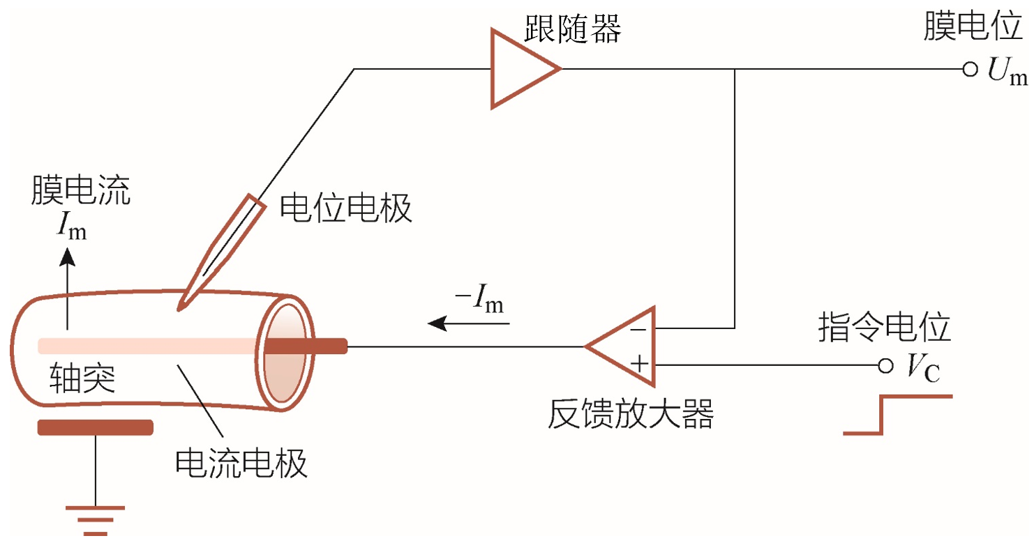 )是通过插入乌贼巨大轴突的蓝色导线并相对于轴突外的接地导线来测量的,然后将其与实验者设置的命令电压( )进行比较,作为电压钳制反馈放大器(大三角形)的两个不同输入。两个电压之间的差值( )产生反馈电流,作为放大器的输出,由第二根插入的导线(红色)注入轴突。当 时就没有反馈电流。在输入发生阶跃变化时,反馈电流在微秒尺度中迅速将 改变为新的 。因此,电压钳制使实验者能够控制被研究轴突的 ,同时测量保持 达到 值所需的反馈电流量,这种反馈电流量等于流过轴突膜的电流(平行的红色箭头)。反馈电流可以向任一方向流动(即红色箭头可以反转),这取决于 和 的相对值。