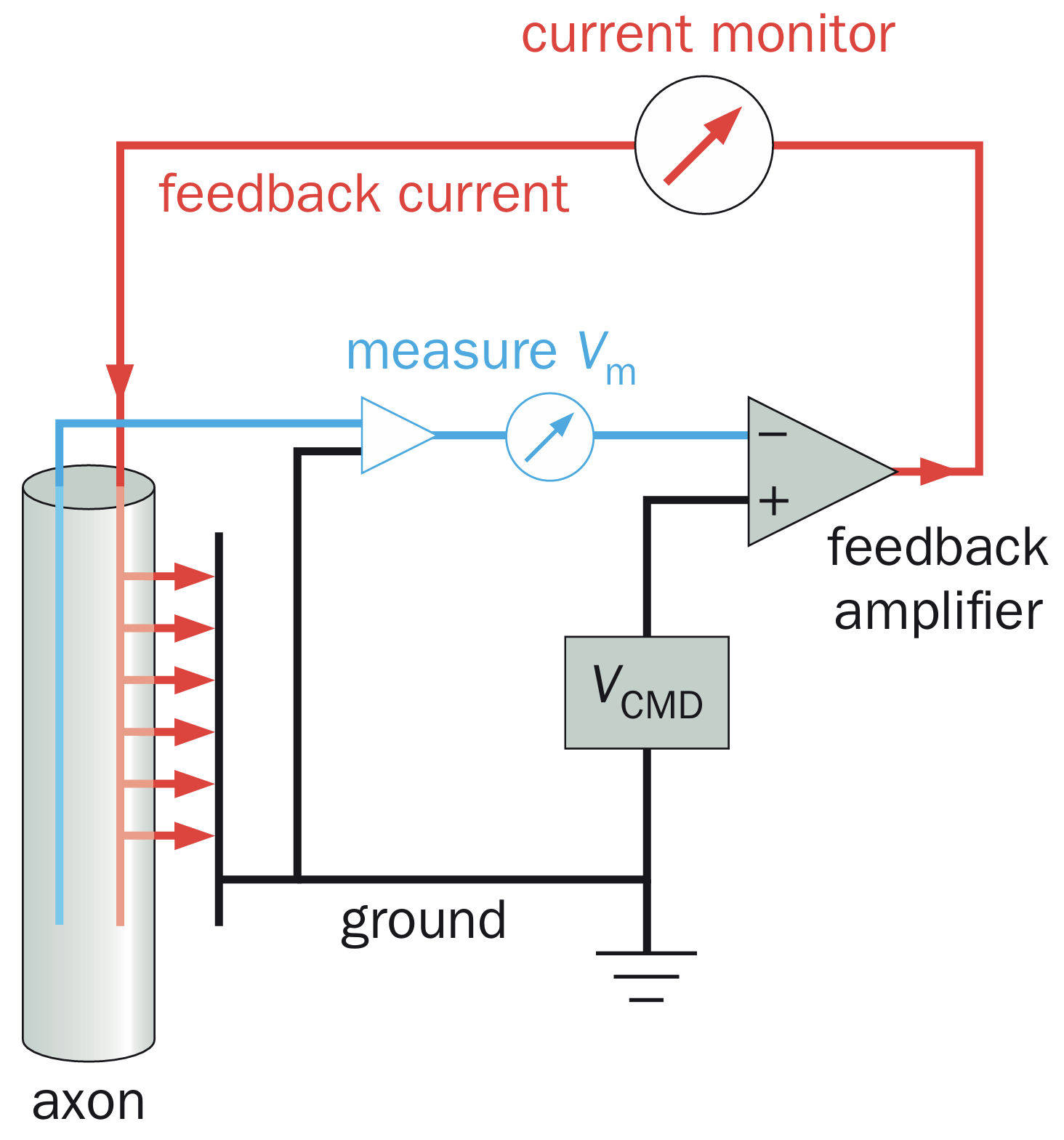 正常情况下对细胞膜的刺激会导致膜电位与离子流的共同变化,但这让对于离子流激活的具体情况模糊起来,因此,为了精确分析离子电导的变化与膜电位的关系,需要一种能随心控制膜电位大小的技术。在监控膜电位的同时,也间接测量了对应稳定的膜电位大小状态下的膜电流。下面给出了电压钳的作用原理。